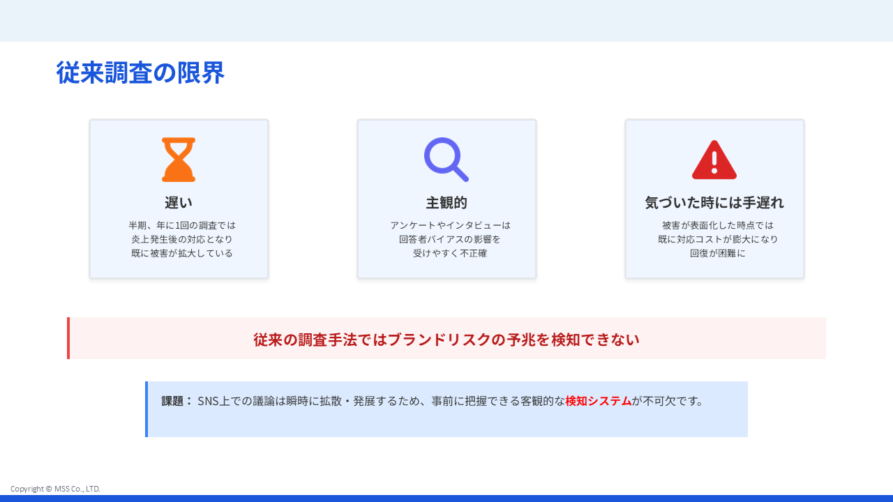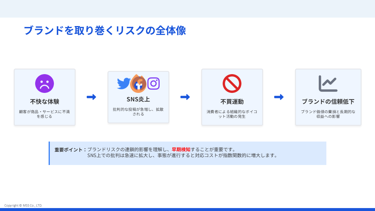 資料ダウンロード Home 資料ダウンロード一覧 ブランドリスクのモニタリング ご紹介資料 ブランドリスクのモニタリング ご紹介資料 2025.10.06 ALL ホワイトペーパー ブランドリスクのモニタリング 資料ダウンロードページ 従来の調査手法ではブランドリスクの予兆を検知できない このようなブランドリスクの連鎖的影響を理解し、早期検知することが重要ですが、 特にSNS上では瞬時に拡散するため、事前に把握できる客観的な検知システムが不可欠です。 MSSの提供するFRSⓇでアンチ層を可視化し、ブランドリスクのモニタリングを行います。 ブランドリスクのモニタリングー01ブランドリスクのモニタリングー02ブランドリスクのモニタリングー03 下記フォームよりご登録いただきますと、ダウンロード用URLがメールにて配信されます。