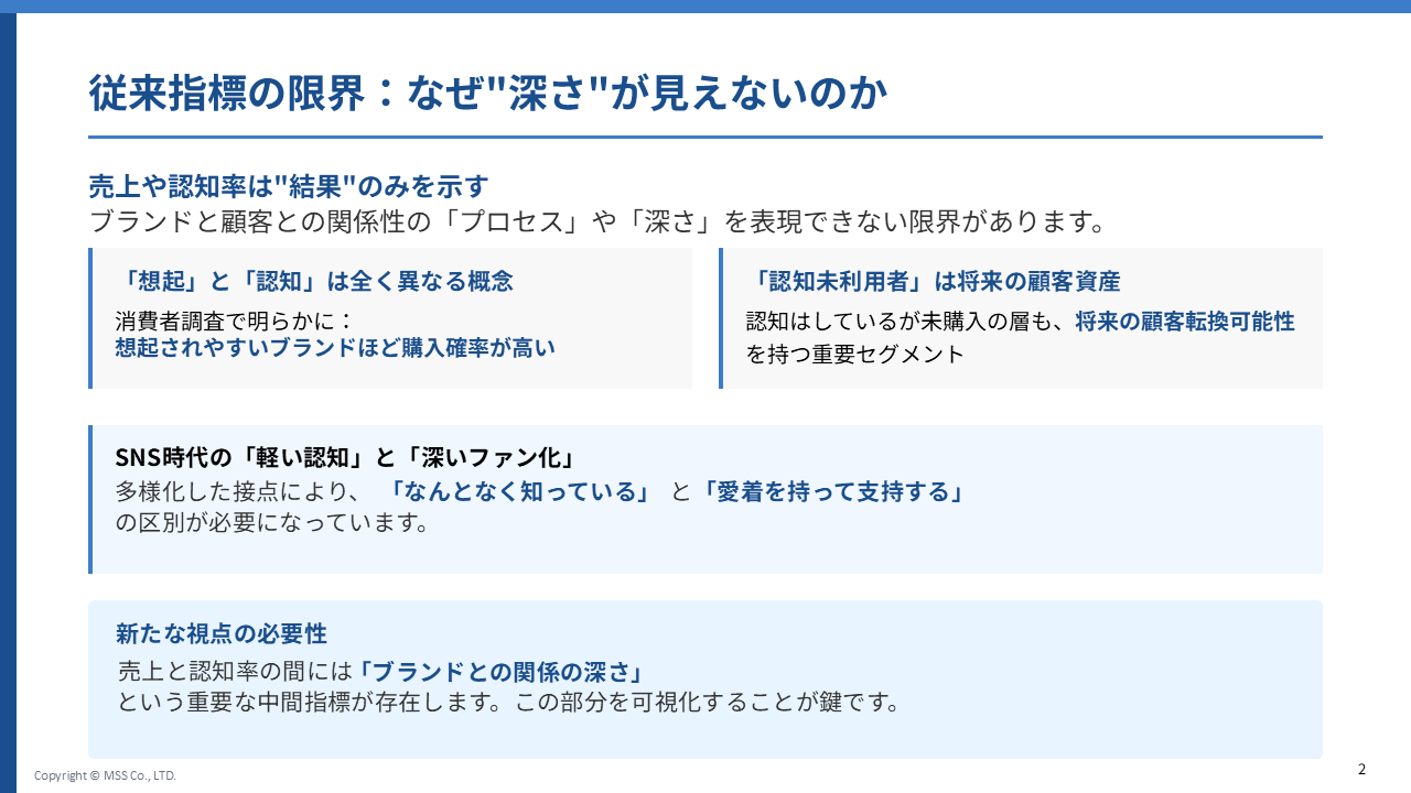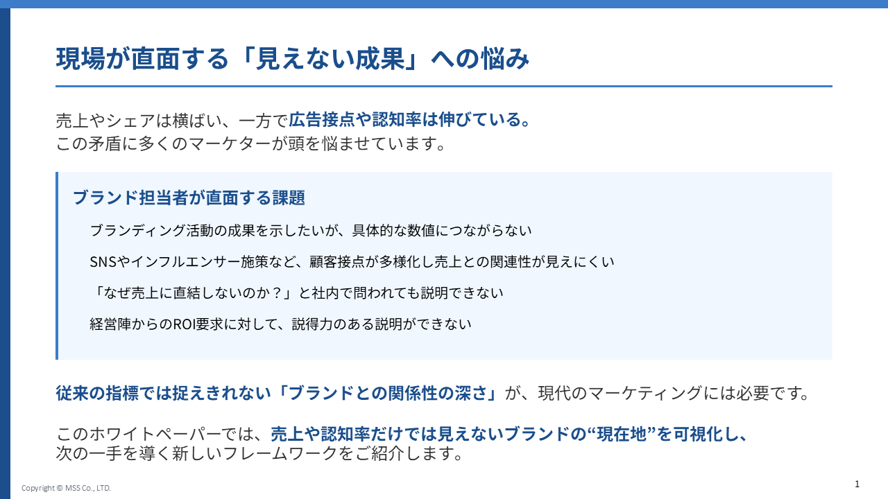資料ダウンロード Home 資料ダウンロード一覧 ブランド現在地と見えない将来顧客の可視化 ご紹介資料 ブランド現在地と見えない将来顧客の可視化 ご紹介資料 2025.10.06 ALL ホワイトペーパー ブランド現在地と見えない将来顧客の可視化 資料ダウンロードページ 現場が直面する「見えない成果」への悩み 売上やシェアは横ばい。一方で広告接点や認知率は伸びている。 この矛盾に多くのマーケターが頭を悩ませています。 ブランドの現在地を可視化する5層構造フレームワーク このホワイトペーパーでは、売上や認知率だけでは見えないブランドの“現在地”を可視化し、 次の一手を導く新しいフレームワークをご紹介しています。 ブランド現在地と見えない将来顧客の可視化-01ブランド現在地と見えない将来顧客の可視化-02ブランド現在地と見えない将来顧客の可視化-03 下記フォームよりご登録いただきますと、ダウンロード用URLがメールにて配信されます。