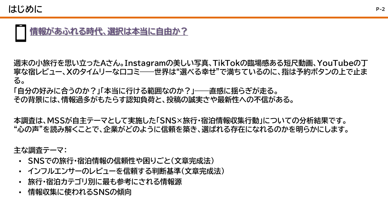 本調査は、MSSが自主テーマとして実施した「SNS×旅行・宿泊情報収集行動」についての分析結果です。