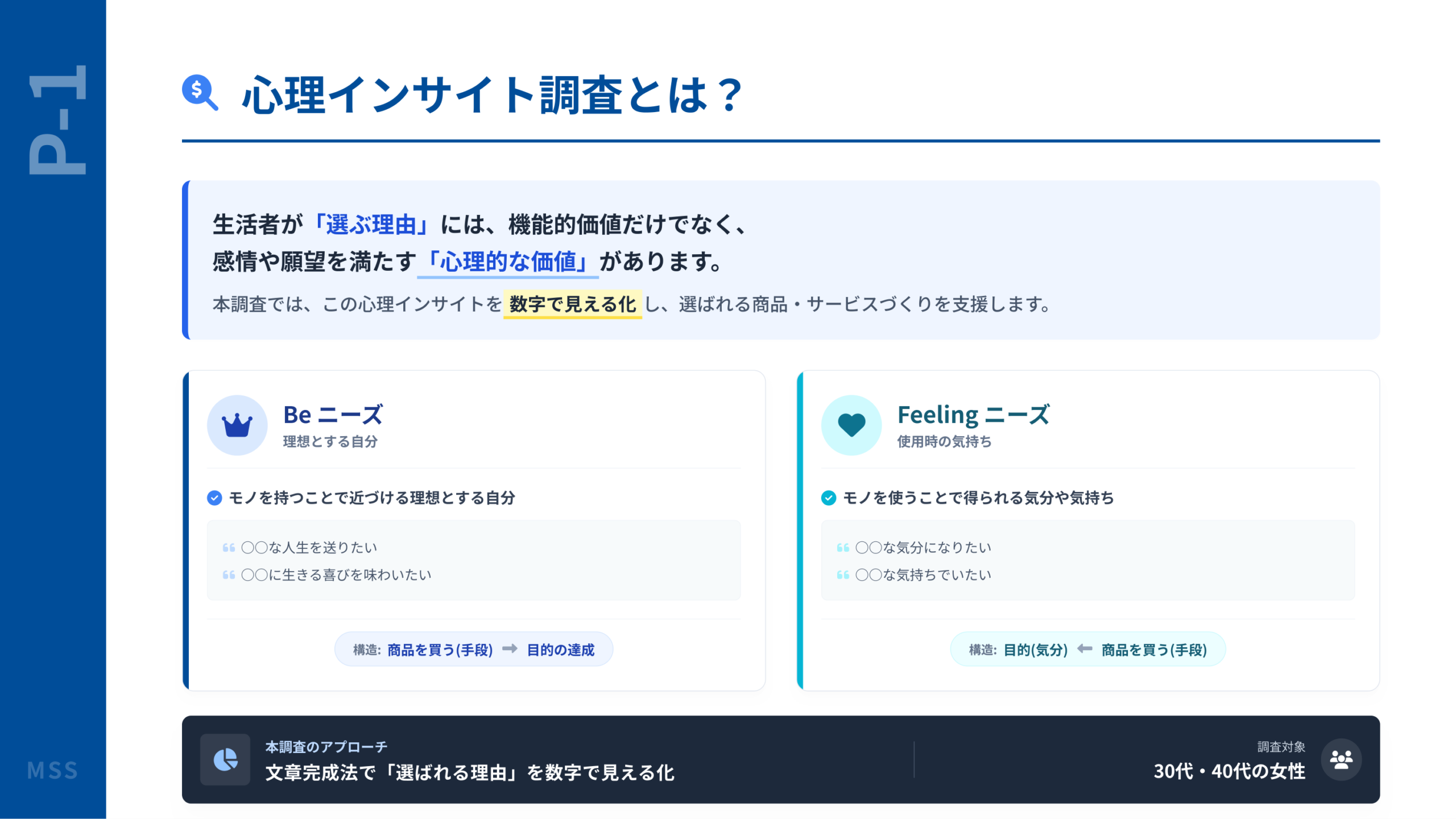 本調査では、この心理インサイトを数字で見える化し、選ばれる商品・サービスづくりを支援します。