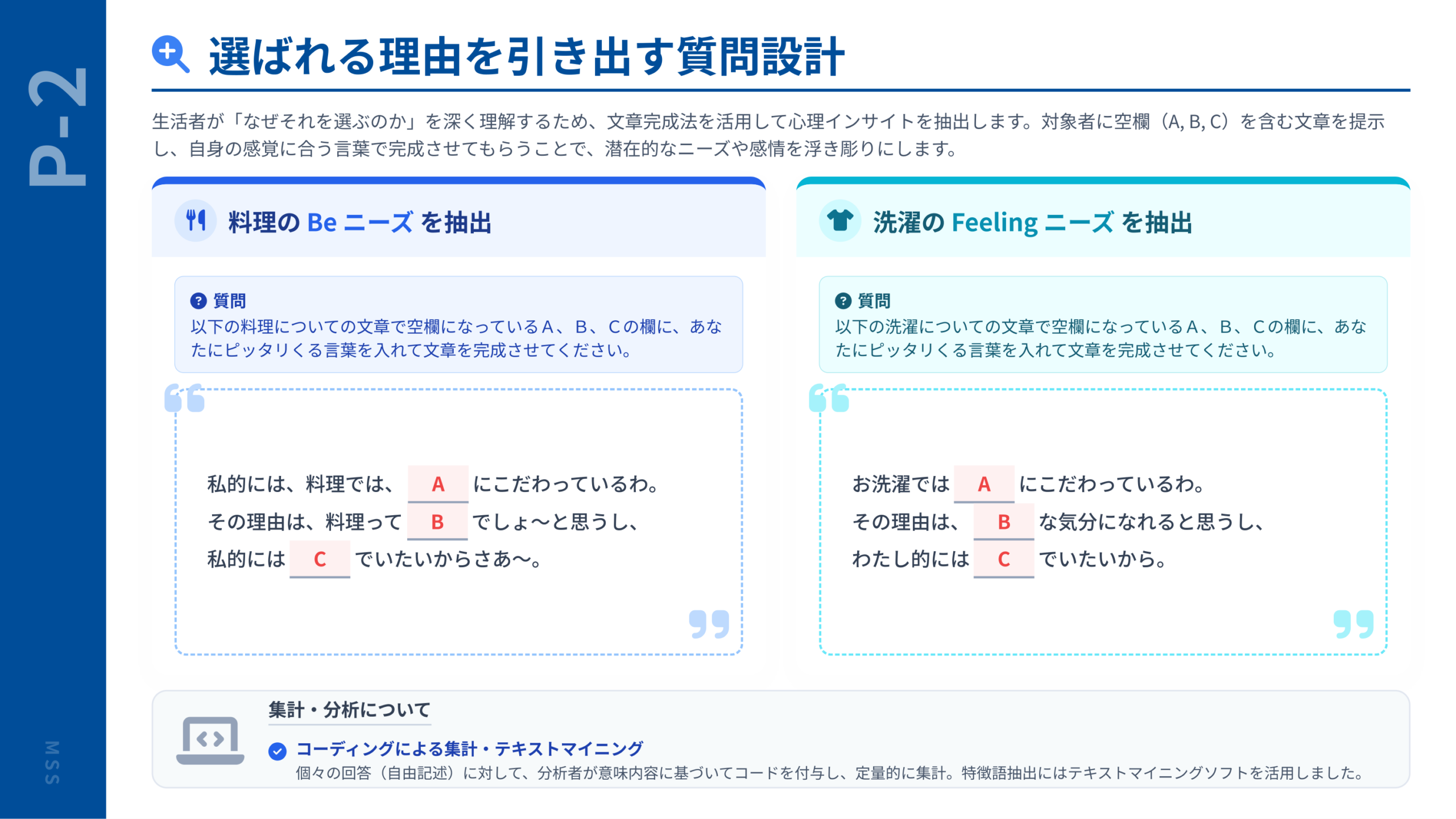 生活者が「なぜそれを選ぶのか」を深く理解するため、文章完成法を活用して心理インサイトを抽出します。対象者に空欄(A, B, C)を含む文章を提示